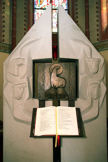 Ambo aus Bronze, weit in die Gemeinde hineingestellt.