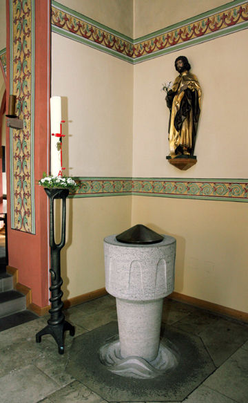 Taufort mit Osterkerze, im Boden ein Relief des Künstlers Dinnendahl,
