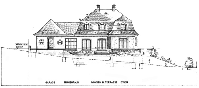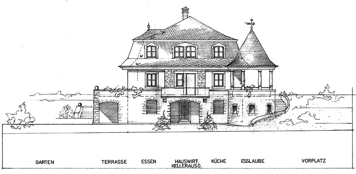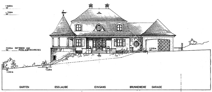 Eingangsseite, Entwurfszeichnung, Maßstab 1:100 Talseite, Entwurfszeichnung, Maßstab 1:100 Gartenseite, Entwurfszeichnung, Maßstab 1:100