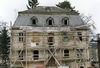 Nach Abriss des Nebengebäudes Gerüststellung und Reparatur des Dachfußes, hier war im Übergangsbereich der beiden Gebäude durch Wassereintritt alles verfault. Die zwölf Dachgauben auf der Mansarde wurden saniert, einige ganz in Eicheholz nach originalem Vorbild erneuert. Die gesamte Dachfläche des Mansardendaches wurde mit Naturschiefer neu eingedeckt, die Kamine erneuert und wie in "alter Zeit" verputzt.
