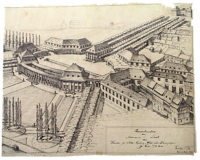 Der Plan dazu aus dem Jahre 1794 von J.W. Becker ist erhalten geblieben. Da die Bauten heute aus ihrem Zusammenhang gerissen sind, gibt nur der Plan eine wirkliche Vorstellung der großzügigen Anlage.