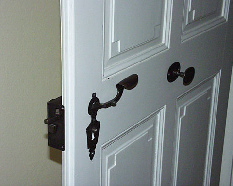 Detail einer historischen Tür im Obergeschoss. Tür und Schloss aus der Bauzeit