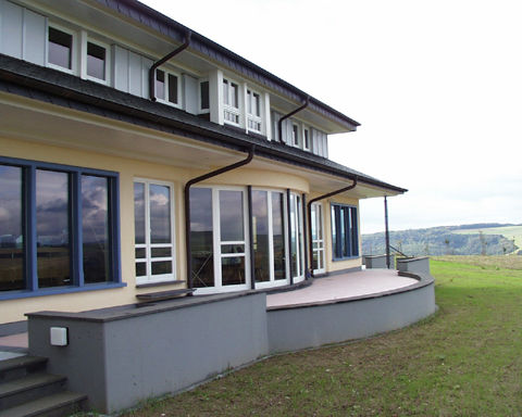 Wohngebäude mit Terrasse, der Gebäudeform angepasst.