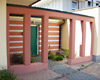 Das kleinere Wohngebäude mit Arztpraxis ist mit einem flachgedeckten Übergangsraum im Abstand von 5 m an das Wohngebäude angegliedert.