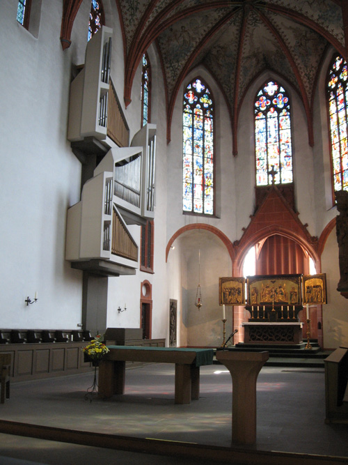 dahinter Ambo, links Tabernakel, rechts Evangeliar.