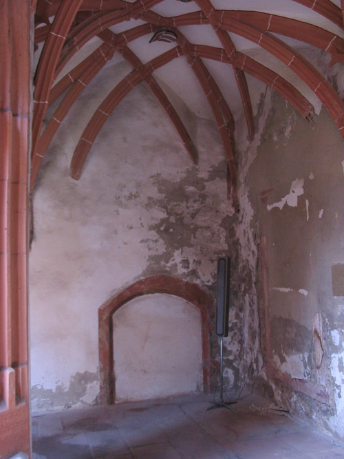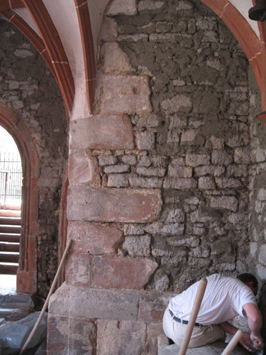 Entfernen der versalzten Putze im Kreuzgang und Wand trocknen lassen.