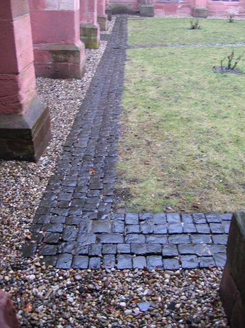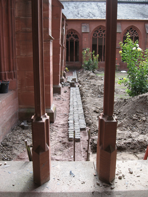 Regenrinne und Nischen zwischen den Strebepfeilern im Innenhof neu pflastern.