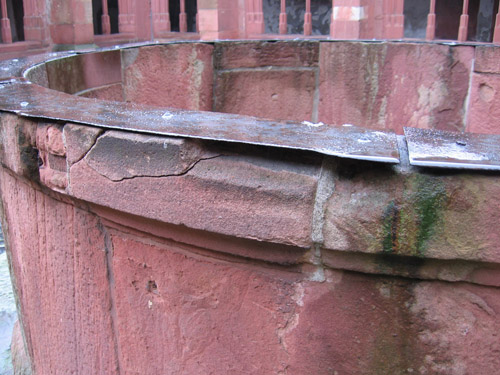 Schäden durch Metallbefestigungen am Brunnenrand.