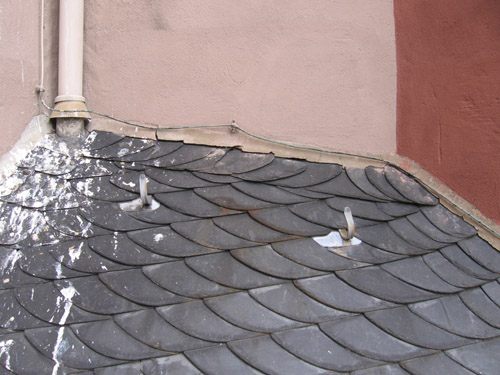 Falsche Wandanschlüsse der Seitendächer und falsches Schiefergebinde.
