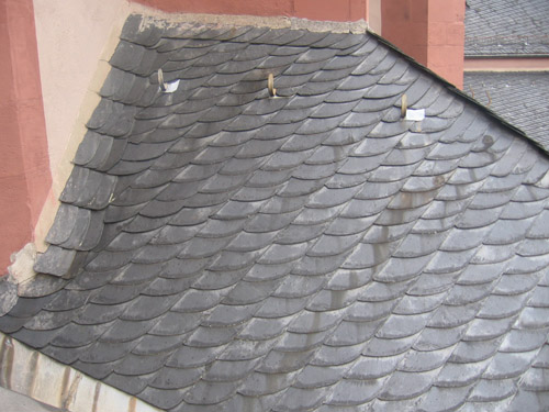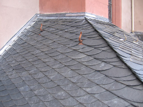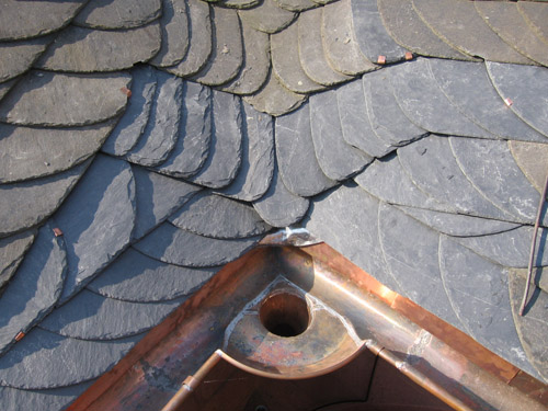 Kupferdachrinnen und Fallrohre an den 4 Seiten im Innenhof anbringen und Schiefer ergänzen.