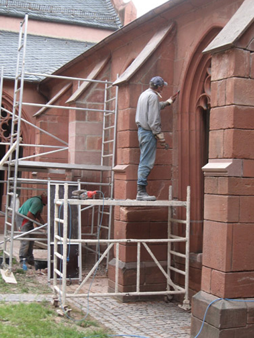 Fassen der neuen Sandsteinteile, Gewölberippen und Maßwerkfenster.