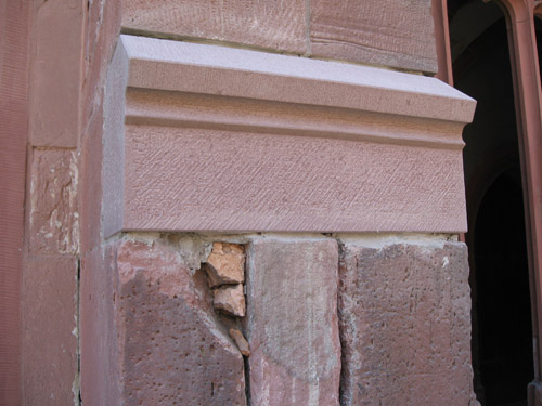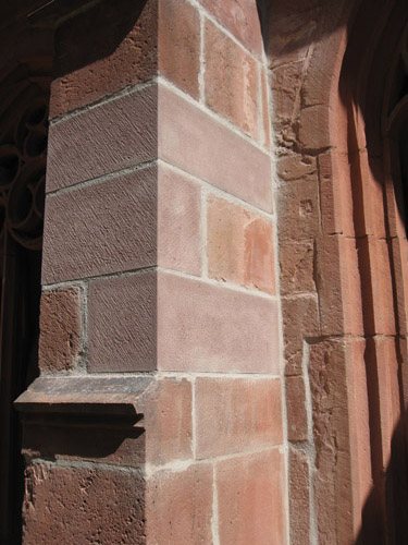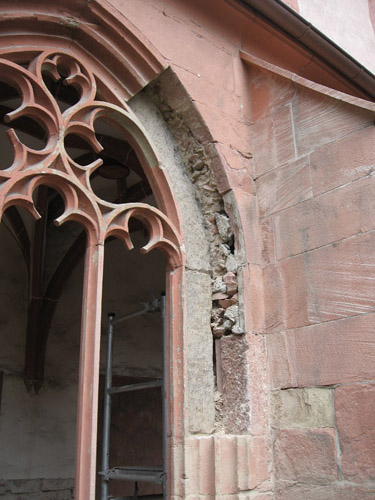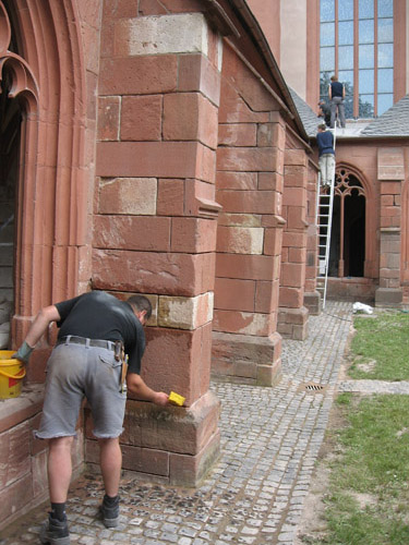 Sandsteinsanierung der Strebepfeiler im Innenhof des Kreuzganges. Ausbau zerstörter Werksteine.