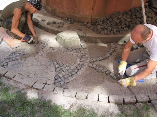 Bogenförmiges pflastern mit Basaltsteinen um den Brunnen.