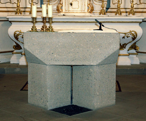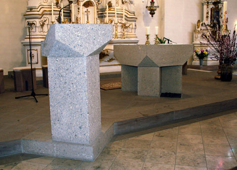 Neuer Altar in der Gemeinde aus Waiberner Tuff, Entwurf und Bearbeitung von Ludwig Dinnendahl.