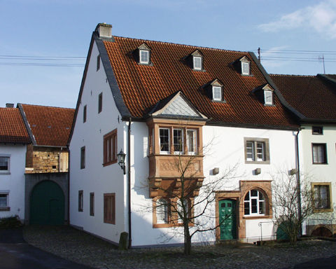Der Hauseingang liegt in der Mitte der Hausfront (Straßenseite) und unmittelbar benachbart befindet sich ein großes Rundbogenfenster mit profiliertem Gewände, dessen Steinmetzzeichen erlauben, den Bau auf die Zeit um 1574 zu datieren (vergleiche Monzingen). Ganz am rechten Ende der Traufseite ist der Kellereingang mit Rundbogenschluß und einem seitlichen Steinschiebefenster eingebaut. Die zu dieser Tür führende Treppe verläuft parallel zur Hausfront.