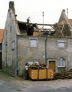 Foto des Gebäudes beim Abriss des alten Dachstuhles