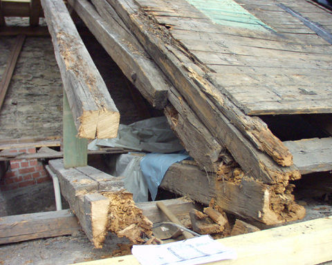 Total verfaulte Sparren und Balken der Konstruktion am Dachfuß oberhalb der Rinne.