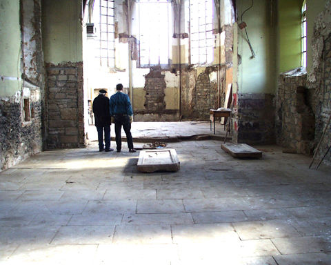 und nach Ausbau des Holzfußbodens. Die beiden Grabplatten aus dem hinteren Bereich des Langhauses auf dem Transport zum Chorraum.