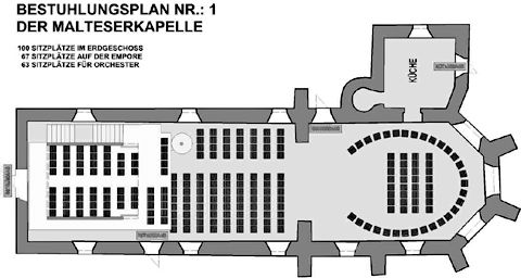 Grundriss mit Bestuhlungsplan für ehem. Kapelle, Langhaus und Empore.
