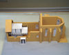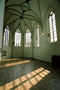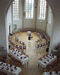 Im Erdgeschoss sind in diesem neuen Haus die notwendigen Sanitärräume geschaffen, zudem Garderobe und eine Teeküchennische. Die Empore hat einen weiteren kleinen Sitzungsraum mit zweiseitigem Galerieumgang, von dem aus die freigelegten und restaurierten mittelalterlichen Malereien zu sehen sind. Der kleine Sitzungsraum ist auf der Vorder- und Rückseite ganz verglast und der Boden mit Teppich belegt, sowie Einbau eines "Haus im Haus" im Bereich der früheren Empore. Diese Idee stammte von meinen beiden Mitarbeiterinnen, Architektin Anja Ank und Dipl.-Designerin Simone Götz.