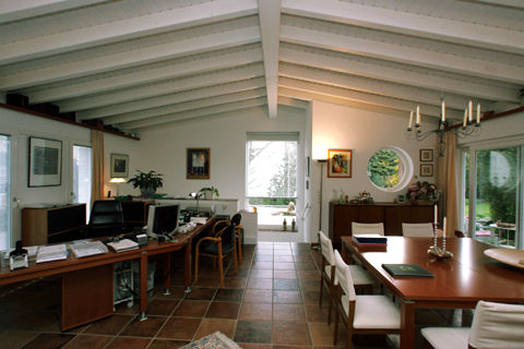 Chebüro und Besprechung als offener Innenraum mit sichtbarer Dachkonstruktion,